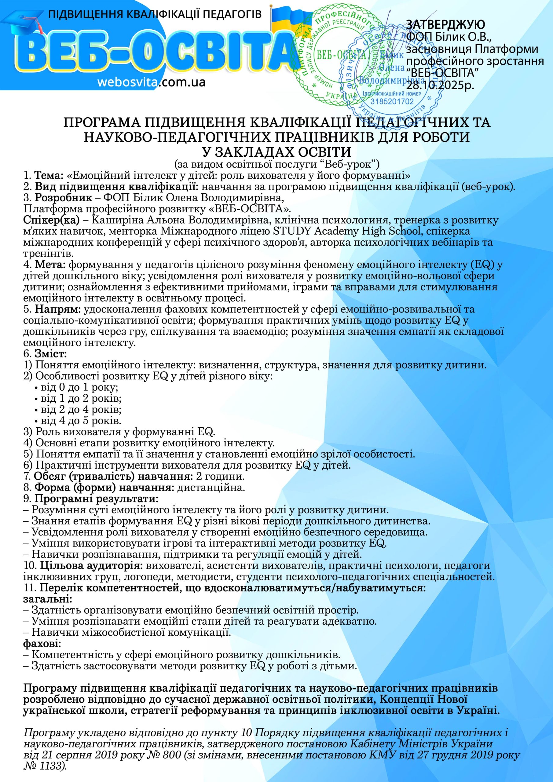 Напрям: удосконалення фахових компетентностей у сфері емоційно-розвивальної та соціально-комунікативної освіти; формування практичних умінь щодо розвитку EQ у дошкільників через гру, спілкування та взаємодію; розуміння значення емпатії як складової емоційного інтелекту.