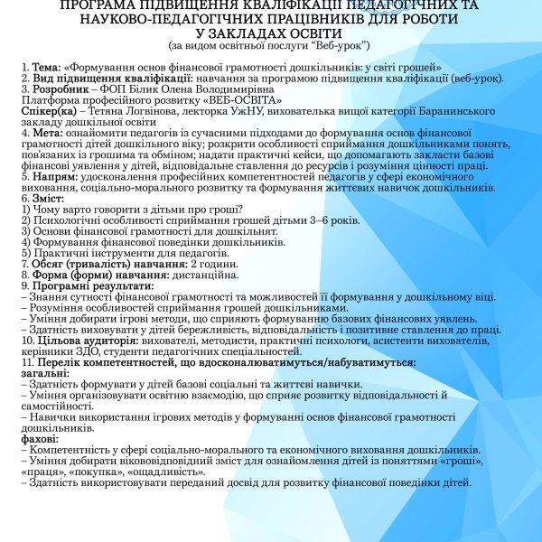 Мета: ознайомити педагогів із сучасними підходами до формування основ фінансової грамотності дітей дошкільного віку; розкрити особливості сприймання дошкільниками понять, пов’язаних із грошима та обміном; надати практичні кейси, що допомагають закласти базові фінансові уявлення у дітей, відповідальне ставлення до ресурсів і розуміння цінності праці.