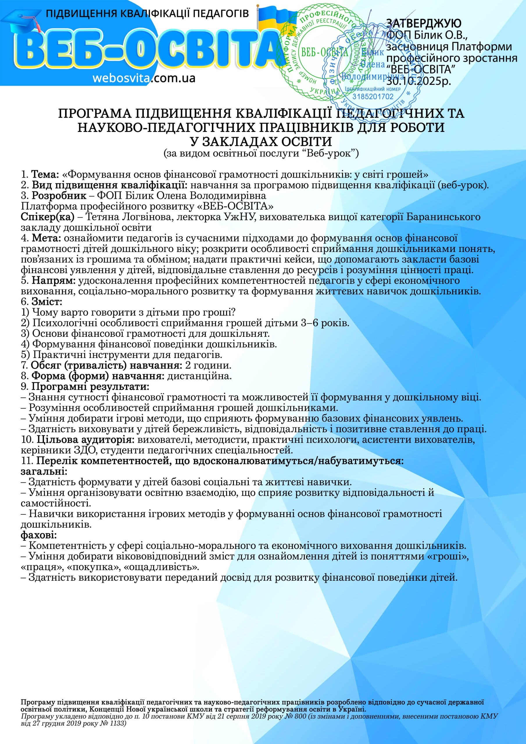 Веб-урок Формування основ фінансової грамотності дошкільників: у світі грошей (Економічне виховання. Вебінари.) – ви отримаєте документ із посиланням на перегляд відео!