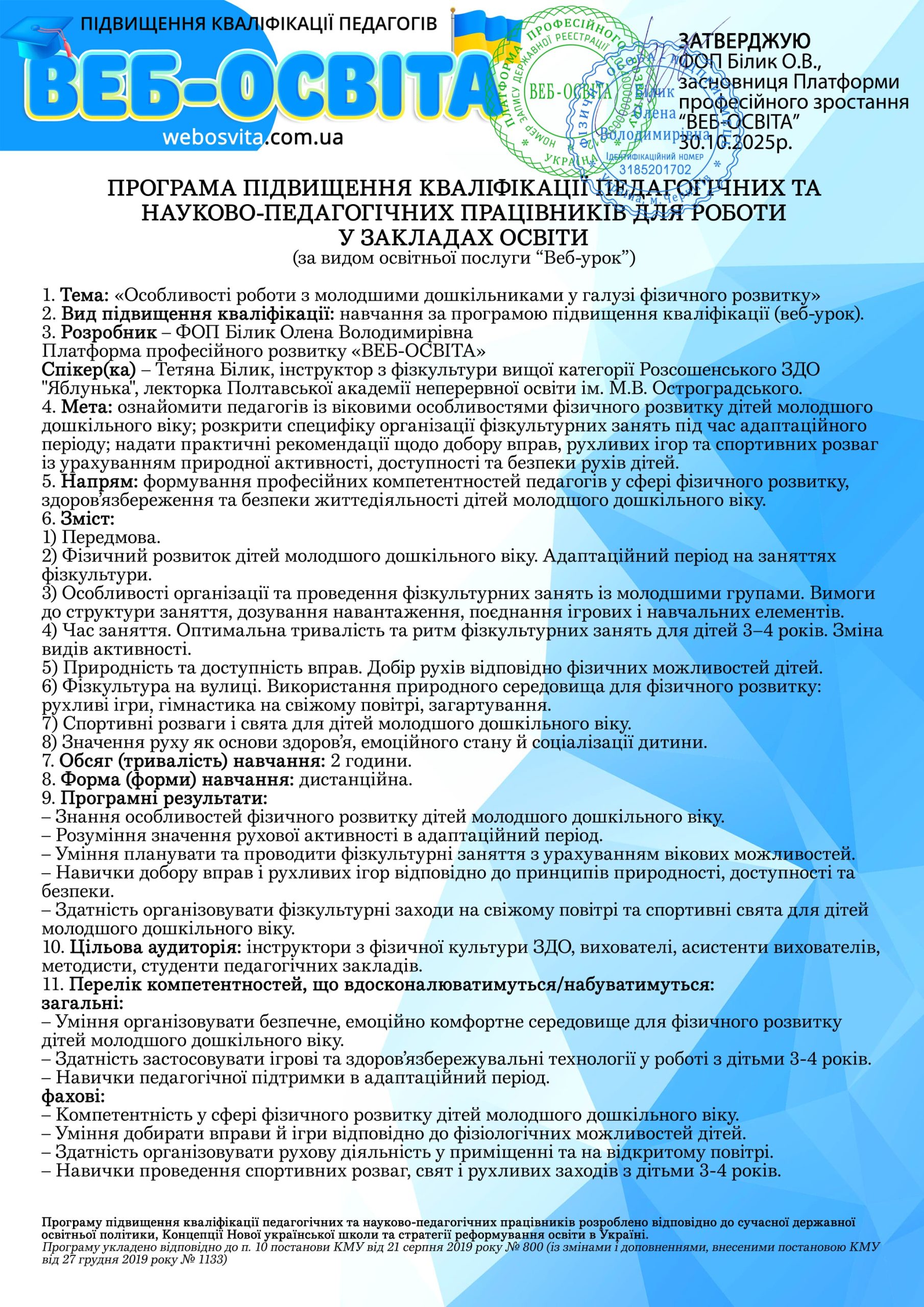 Веб-урок Особливості роботи з молодшими дошкільниками у галузі фізичного розвитку (Фізичний розвиток. Вебінари. Курси підвищення кваліфікації.) – ви отримаєте документ із посиланням на перегляд відео!
