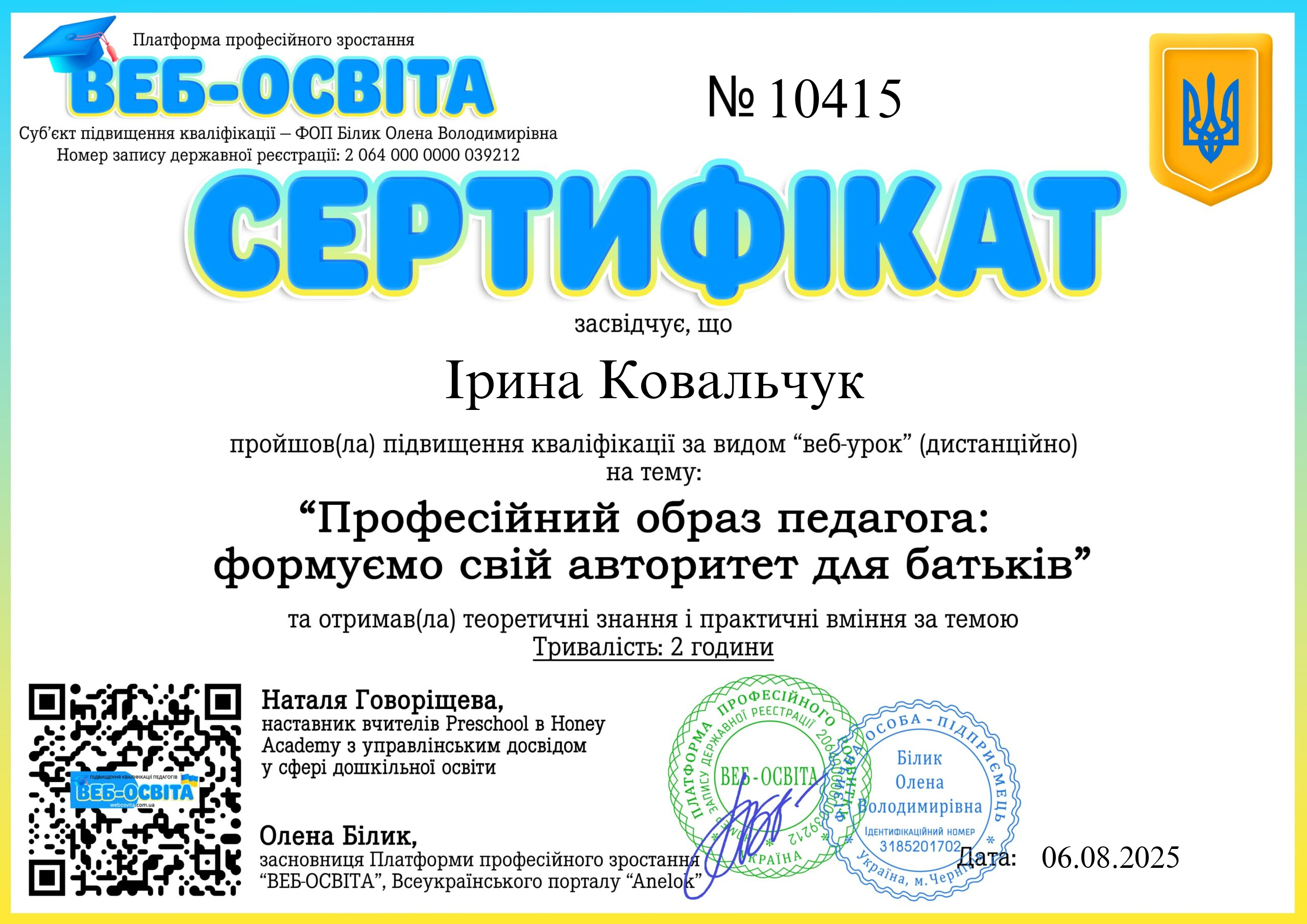 Увага! Видані сертифікати на сайті https://web-osvita.anelok.in.ua/ у період 2020-08.04.2025 є дійсними. Видані сертифікати зі старого домену можете перевірити тут: 2020-2023 , 2024-2025.