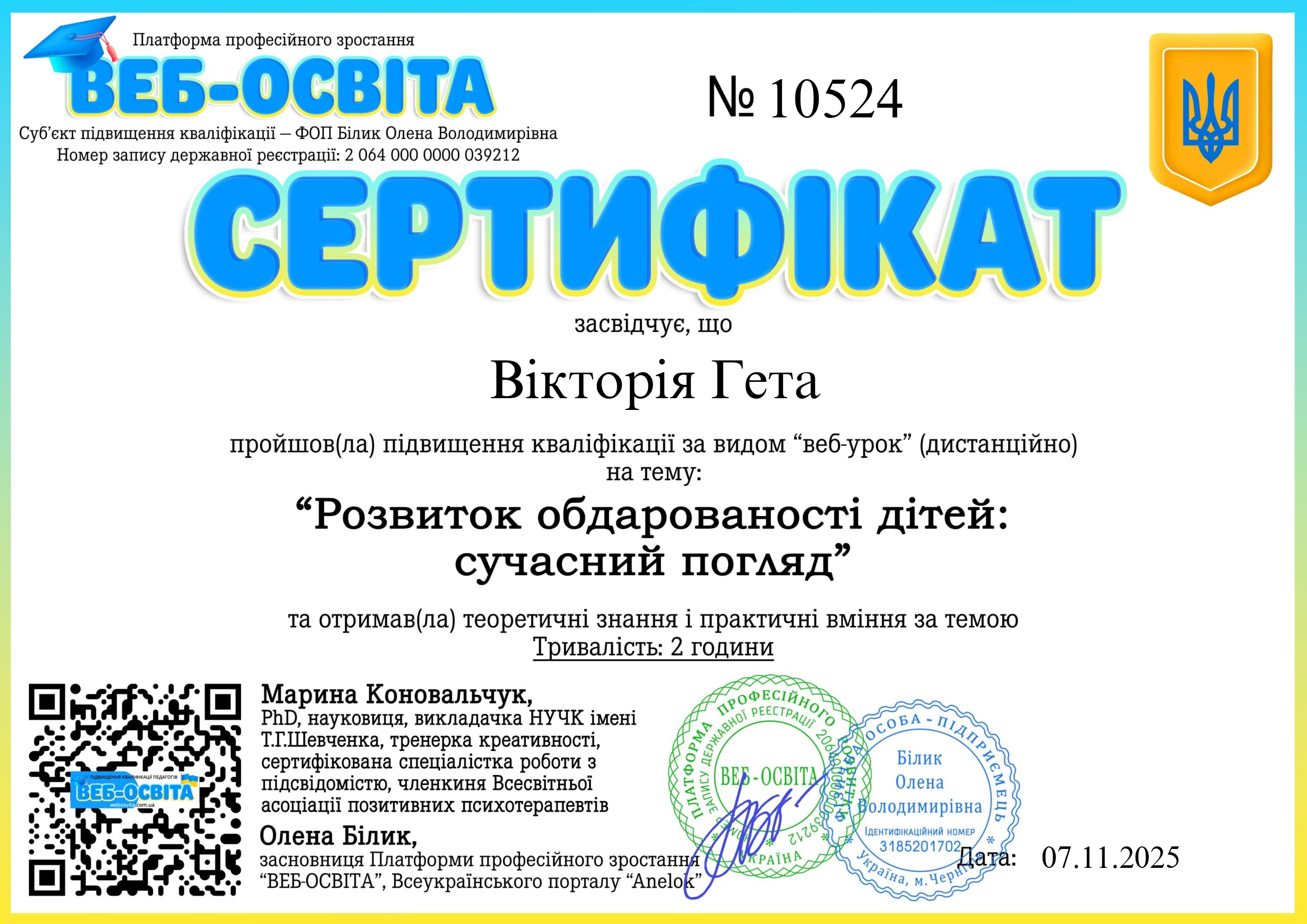 Увага! Видані сертифікати на сайті https://web-osvita.anelok.in.ua/ у період 2020-08.04.2025 є дійсними. Видані сертифікати зі старого домену можете перевірити тут: 2020-2023 , 2024-2025.