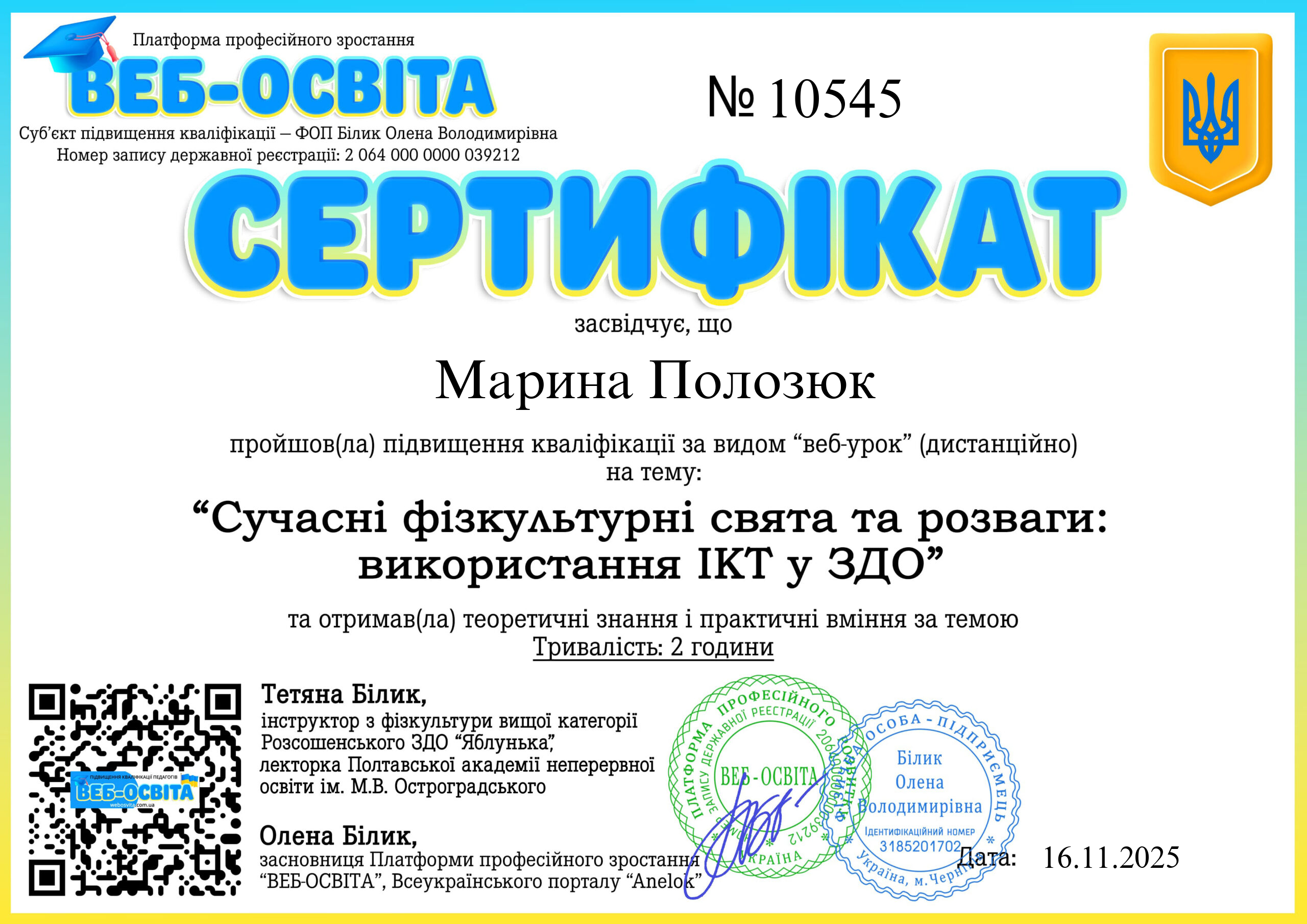 ФОП Білик Олена Володимирівна (webosvita.com.ua) є офіційним суб’єктом підвищення кваліфікації педагогів. Видані документи є офіційними та юридично дійсними. Для того, щоб перевірити сертифікат педагога, введіть у поле пошуку номер виданого сертифікату  чи прізвище та натисніть кнопку шукати.
