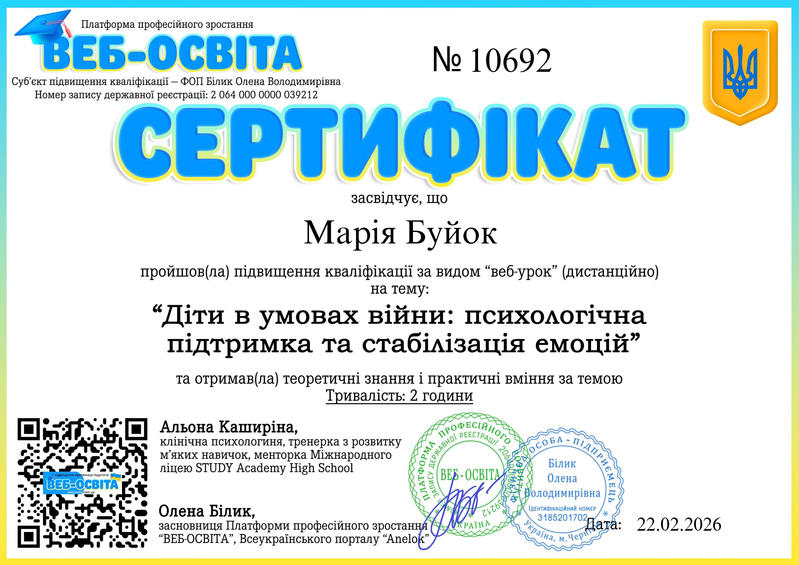 Веб-урок Діти в умовах війни: психологічна підтримка та стабілізація емоцій (Вебінар) Web-Osvita Certificate