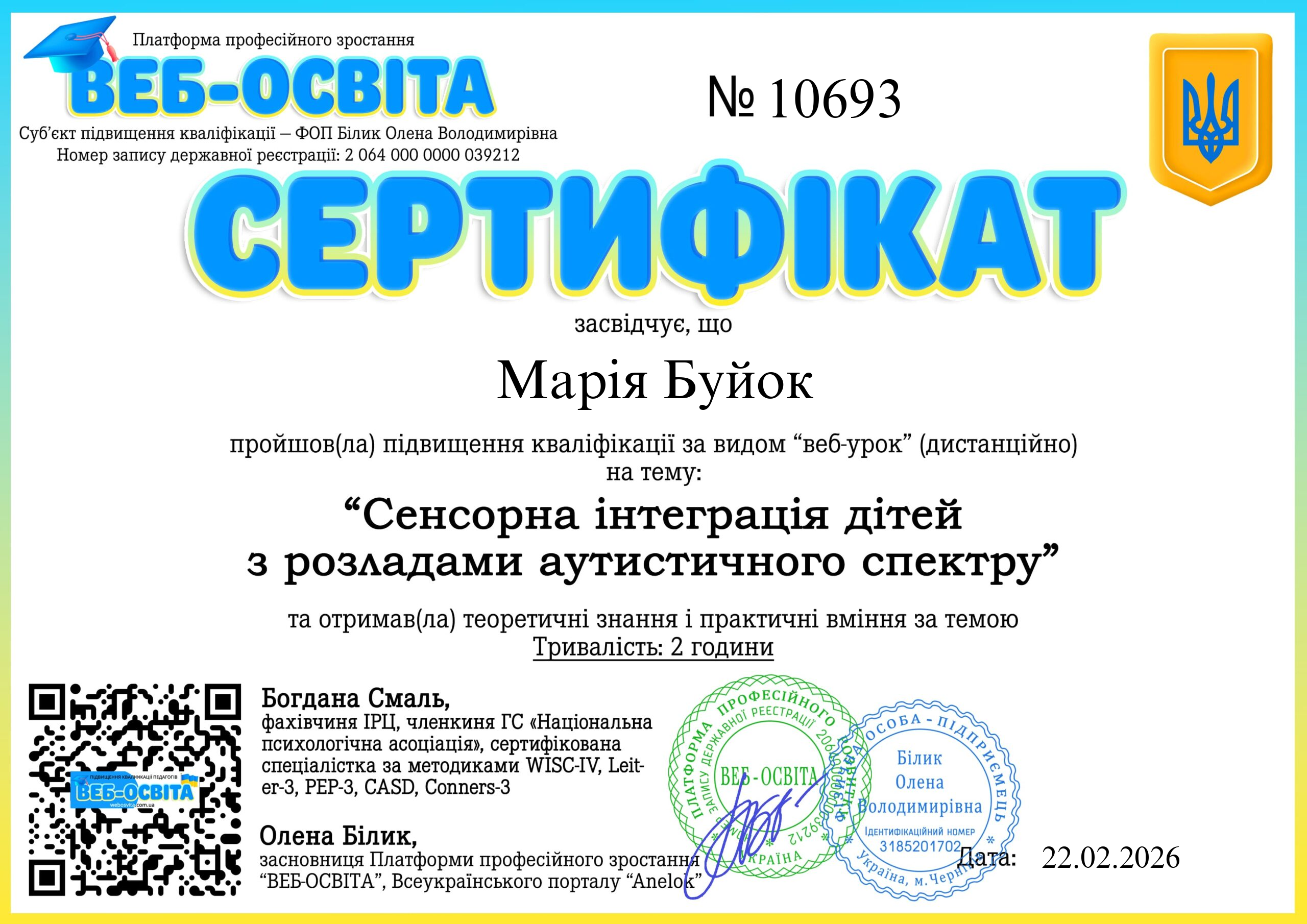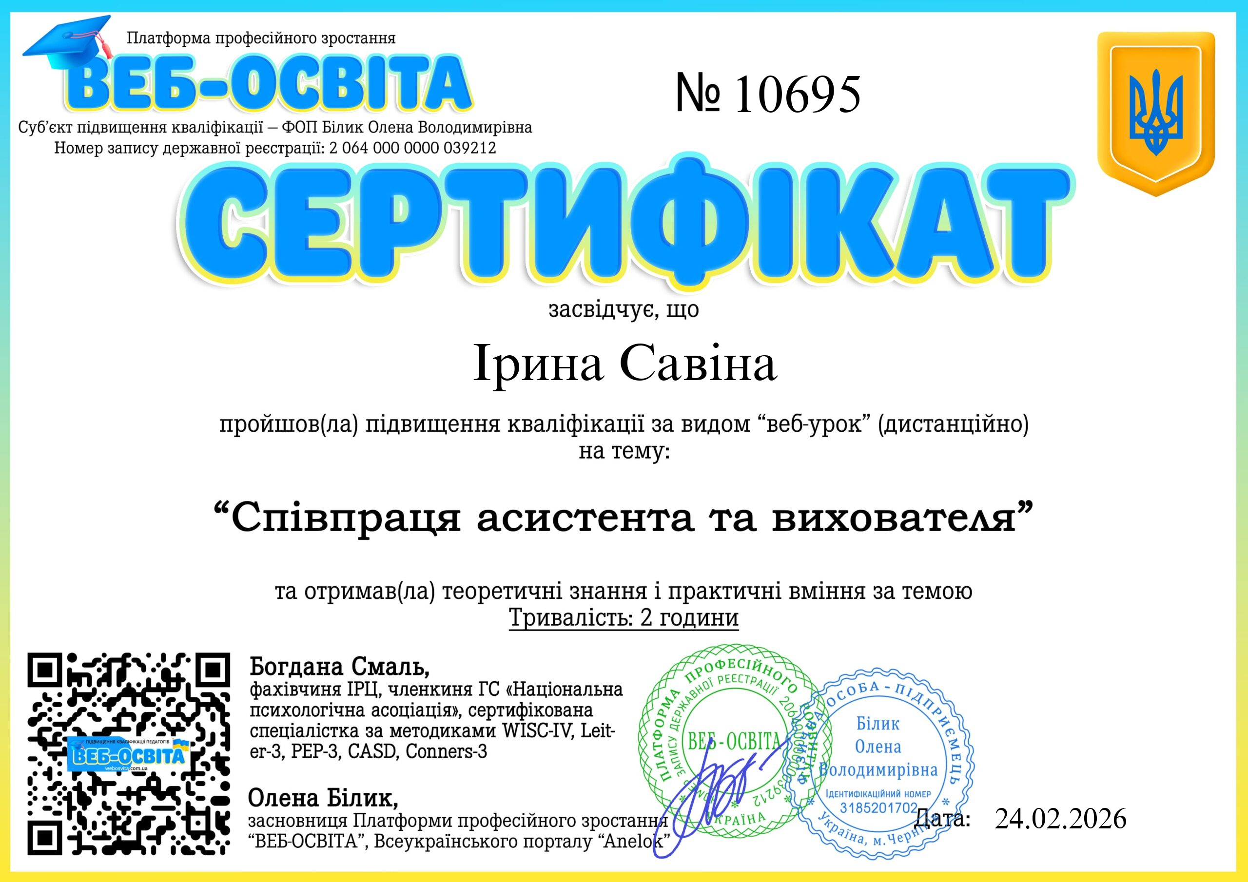 ФОП Білик Олена Володимирівна (webosvita.com.ua) є офіційним суб’єктом підвищення кваліфікації педагогів. Видані документи є офіційними та юридично дійсними. Для того, щоб перевірити сертифікат педагога, введіть у поле пошуку номер виданого сертифікату  чи прізвище та натисніть кнопку шукати.