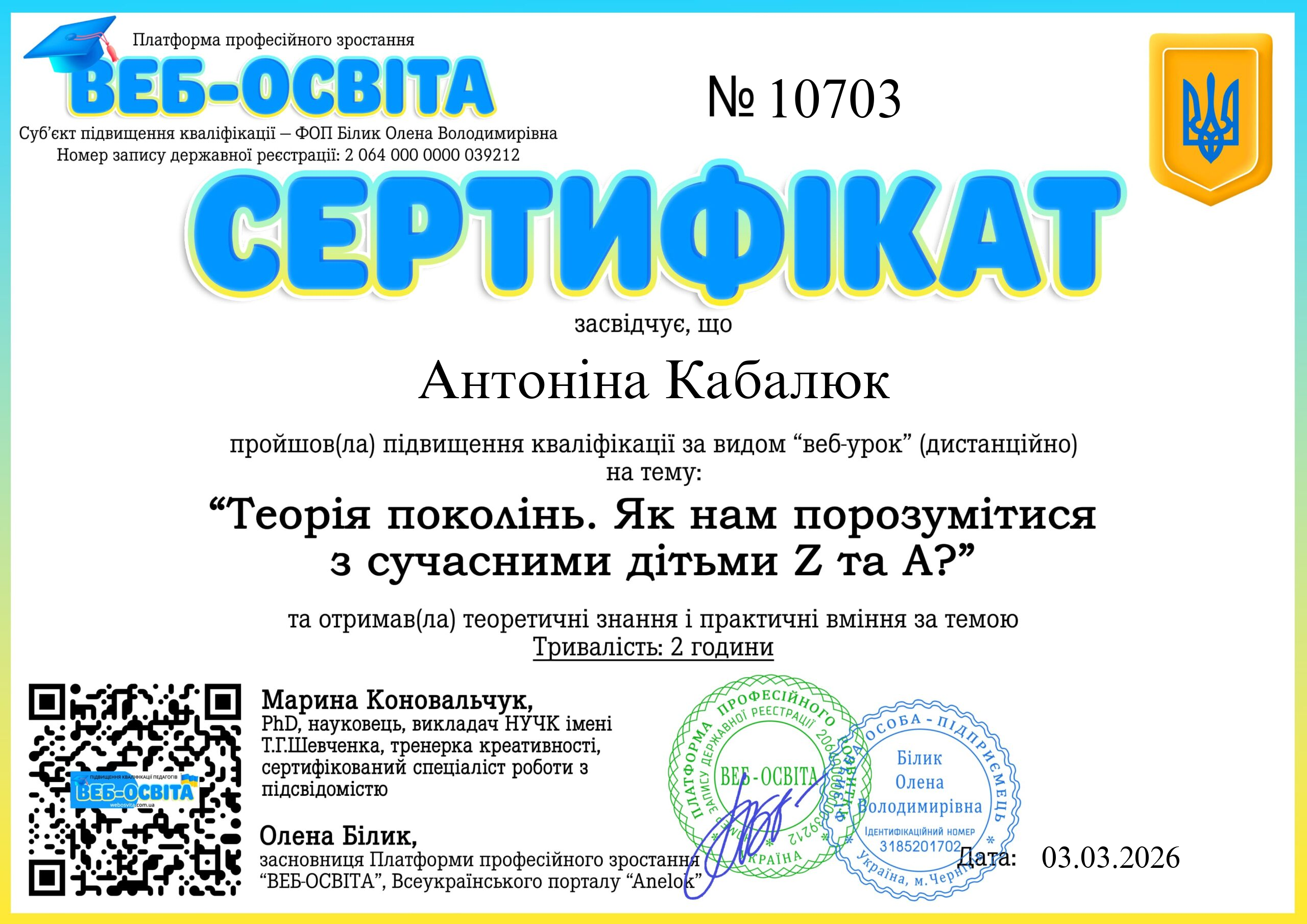 Веб-урок Теорія поколінь. Як нам порозумітися з сучасними дітьми Z та А? (Вебінар) Web-Osvita Certificate