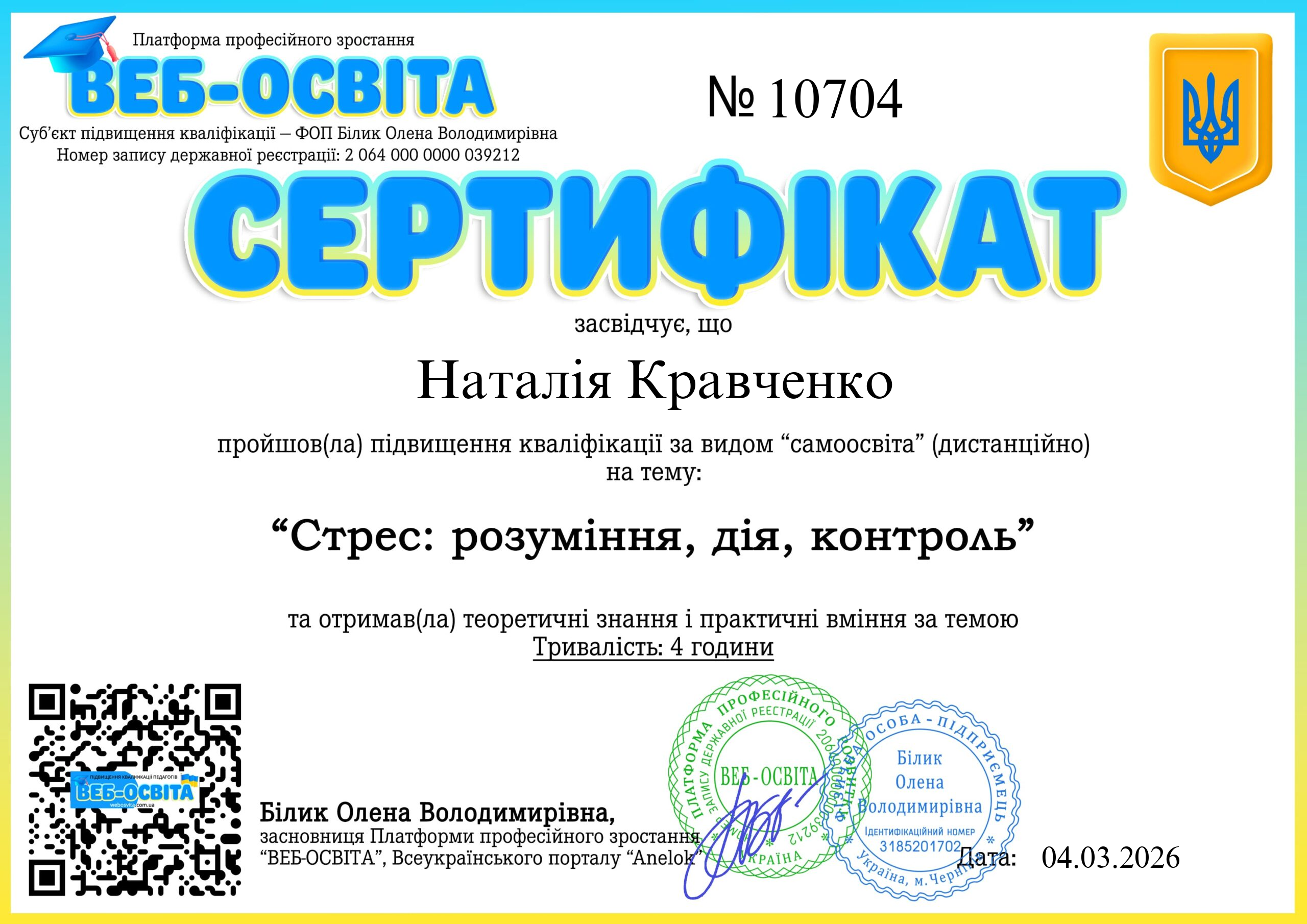 Увага! Видані сертифікати на сайті https://web-osvita.anelok.in.ua/ у період 2020-08.04.2025 є дійсними. Видані сертифікати зі старого домену можете перевірити тут: 2020-2023 , 2024-2025.